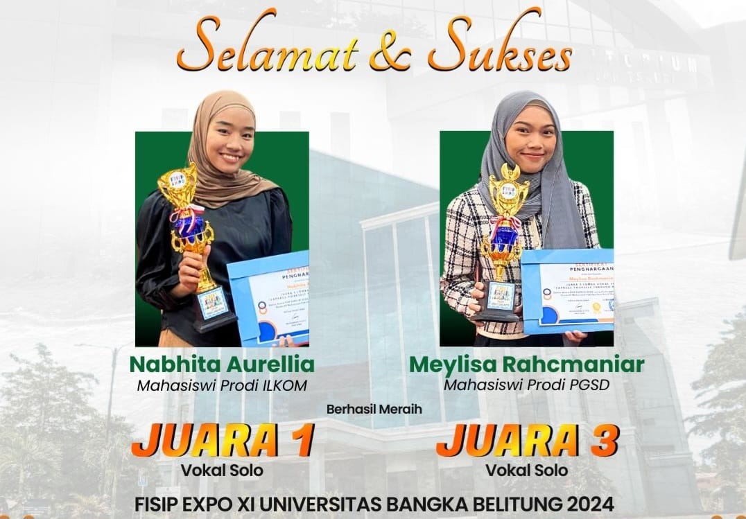 BANGKA, infoupdate.co – Dua mahasiswi Universitas Muhammadiyah Bangka Belitung (Unmuh Babel), Nabhita Aurellia dan Meylisa Rahcmaniar, sukses meraih prestasi membanggakan di ajang lomba vokal solo FISIP Expo Universitas Bangka Belitung (UBB). Dalam lomba ini, Nabhita berhasil meraih juara 1, dan Meylisa menjadi juara 3.