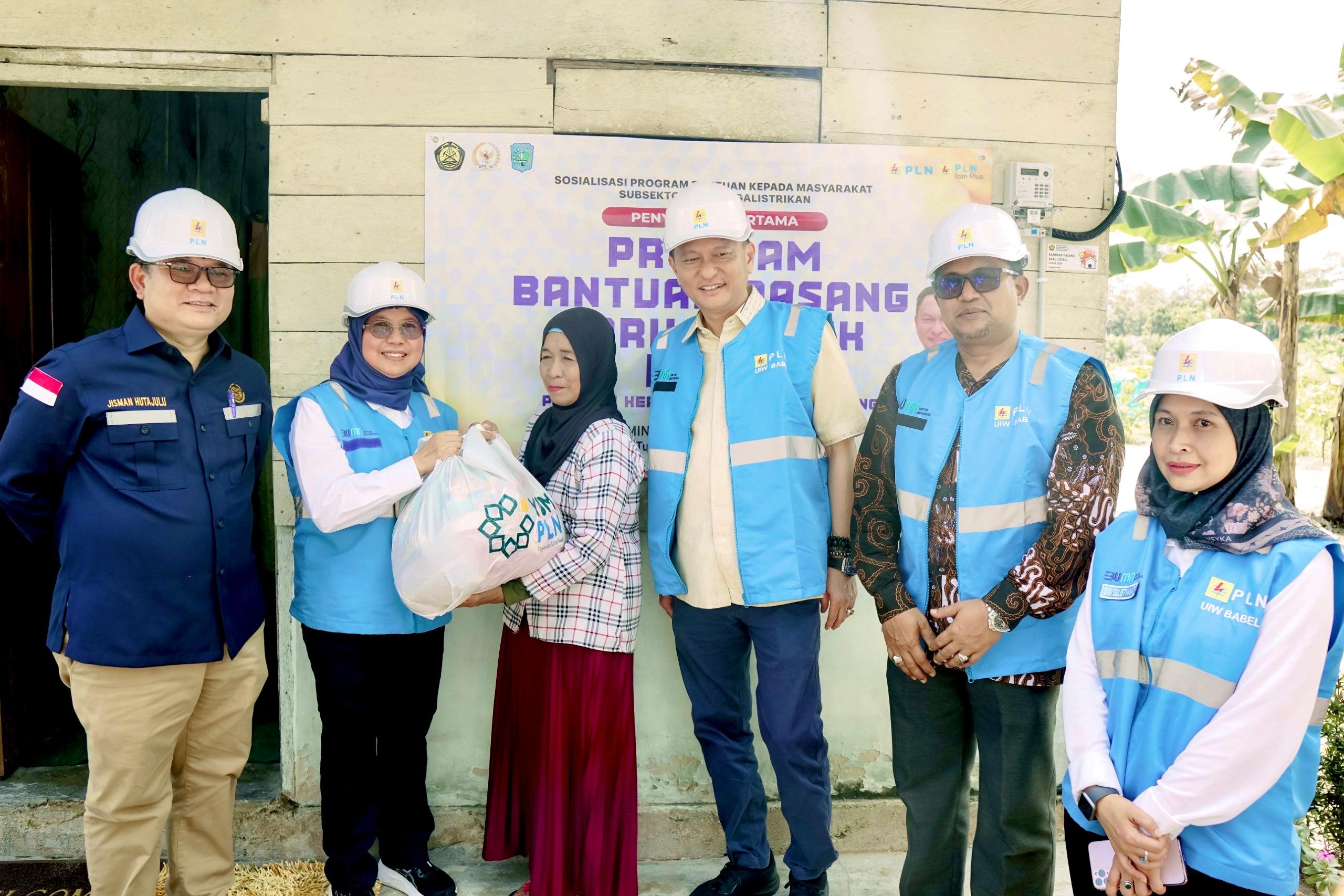 Direktur Niaga dan Retail PLN, Edi Srimulyanti (dua dari kirimenyerahkan sembako bantuan kepada penerima bantuan BPBL bersama Ketua Komisi XII DPR RI, Dirjen Gatrik, Pemda dan GM PLN UIW Babel, Dini Sulistyawati (paling kanan).