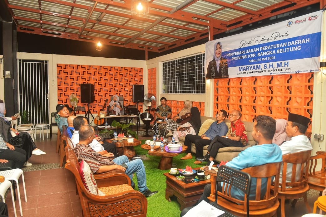 PANGKALAN BARU, infoupdate.co – Anggota DPRD Provinsi Kepulauan Bangka Belitung (Babel), Maryam, melaksanakan kegiatan sosialisasi penyebarluasan Peraturan Daerah (Perda) Nomor 4 Tahun 2019 tentang Ketenagakerjaan. Kegiatan ini digelar di Tepian Café, Kecamatan Pangkalan Baru, Bangka Tengah, Sabtu (24/5/2025), dan dihadiri oleh sejumlah tokoh masyarakat, perwakilan dinas, serta serikat pekerja.