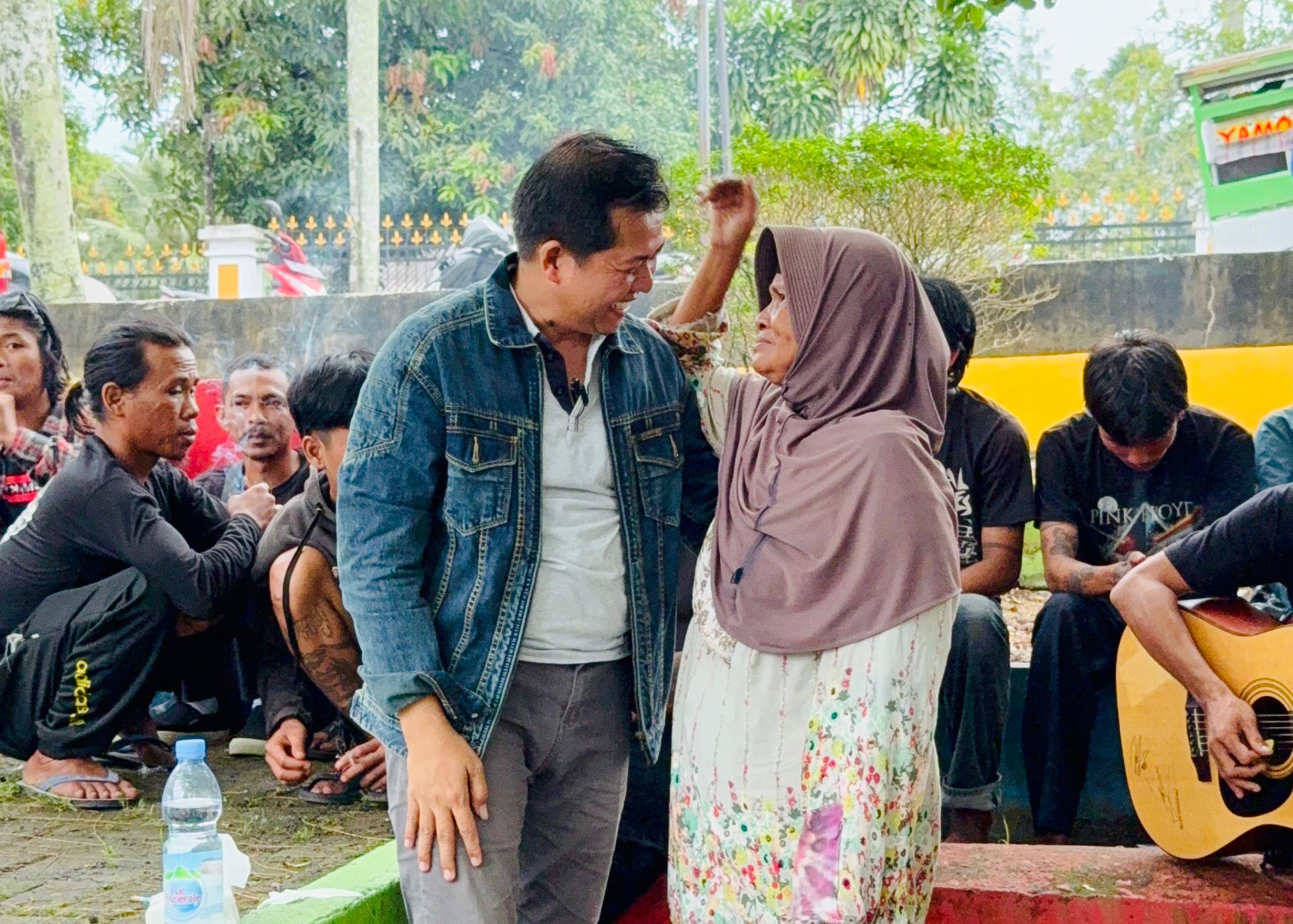 PANGKALPINANG, infoupdate.co– Sedang asyik bercengkerama dengan sekelompok musisi jalanan pada Minggu, 1 Juni 2025 sore, Basit Cinda terharu atas kehadiran seorang nenek dengan gendongan karung berisi barang bekas, yang datang menghampirinya. Tanpa ragu, tokoh muda karismatik ini menyambut si nenek yang mendekat lalu memeluknya, erat.