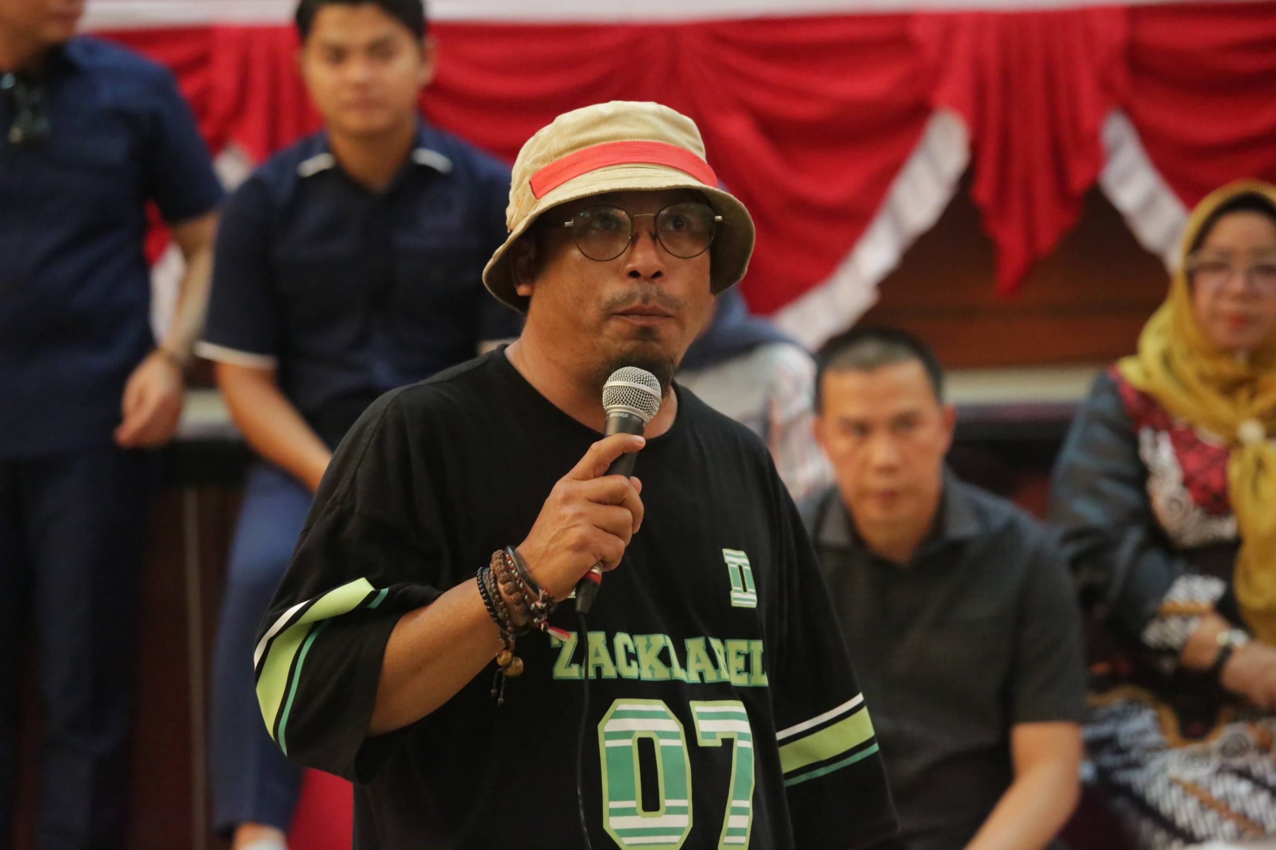 Wahyudi yang dalam kesempatan tersebut mengenakan kaos hitam bertuliskan “ZACKLABEL 07” dan topi pancing berwarna krem, berulang kali menunjuk ke arah spanduk yang terbentang di belakangnya. Spanduk itu bertuliskan, “Kami Warga Desa Batu Beriga Mendukung Penambangan PT TIMAH Apabila Masyarakat DI LIBATKAN.”