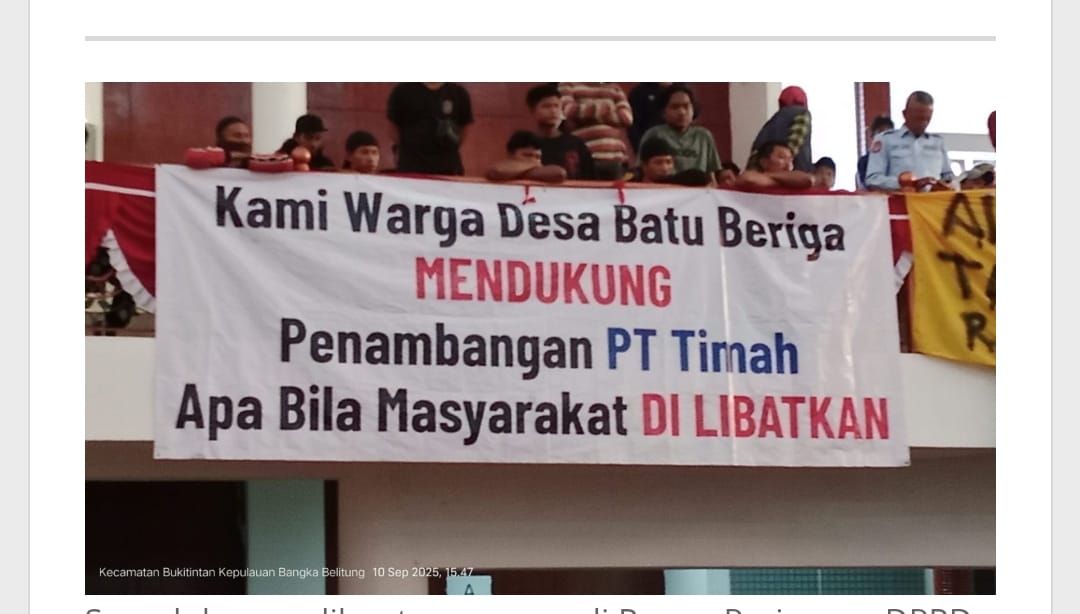 PANGKALPINANG, infoupdate.co — Sejumlah warga Desa Batu Beriga, Kecamatan Lubuk Besar, Kabupaten Bangka Tengah, yang tergabung dalam Aliansi Rakyat Penambang, menyampaikan dukungan terhadap aktivitas penambangan yang dilakukan oleh PT Timah Tbk di wilayah mereka. Dukungan ini disampaikan dalam aksi damai di Gedung DPRD Provinsi Kepulauan Bangka Belitung pada Rabu, 10 September 2025.