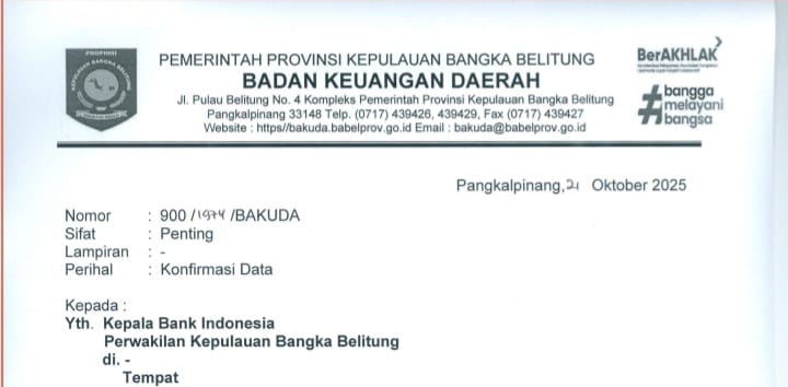 Permintaan penjelasan itu disampaikan Badan Keuangan Daerah (Bakuda) Babel, dengan melayangkan surat tertanggal, 21 Oktober 2025, yang ditujukan ke Kepala BI Perwakilan Kepulauan Bangka Belitung.