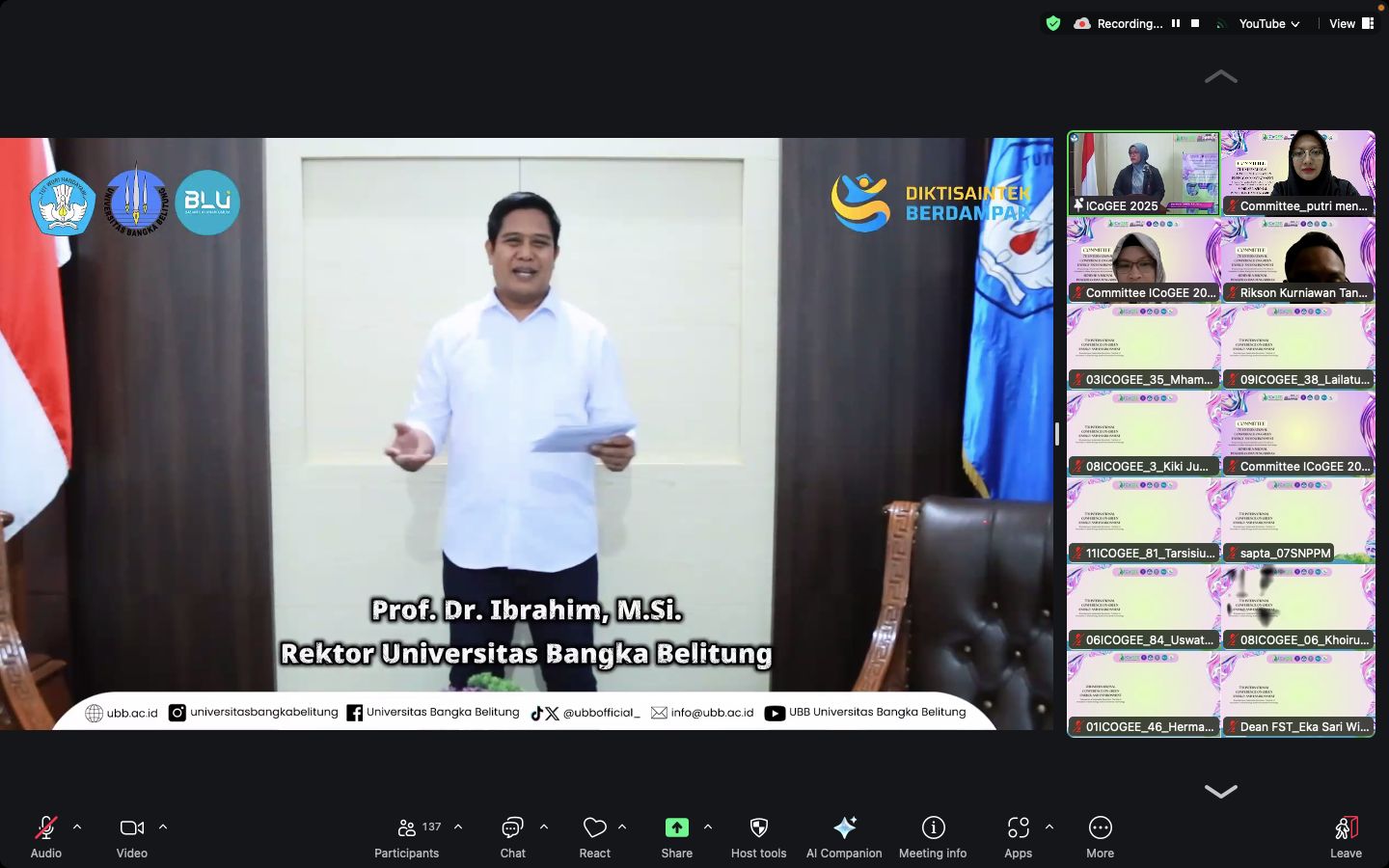 BANGKA, infoupdate.co — Fakultas Sains dan Teknik Universitas Bangka Belitung (UBB) sukses menyelenggarakan dua agenda ilmiah besar berskala nasional dan internasional, yakni The 7th International Conference on Green Energy and Environment (ICoGEE 2025) dan Seminar Nasional Penelitian dan Pengabdian kepada Masyarakat (SNPPM) ke-9, yang berlangsung secara virtual pada 21–22 Oktober 2025.